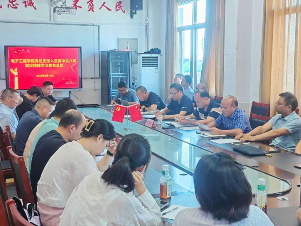 2025年9月,电子工程学院党总支全体党员在北院15-406党建活动室集中学习了党课《深入贯彻中央八项规定精神学习教育总结》。党总支书记解读中央开展八项规定学习教育的三重意义:巩固主题教育成果、密切师生联系、保障教育高质量发展。重点解读八项规定 “以上率下、锲而不舍、抓早抓小” 三大特点;结合教育系统典型案例,对照“学查改一体推进” 要求查摆问题。