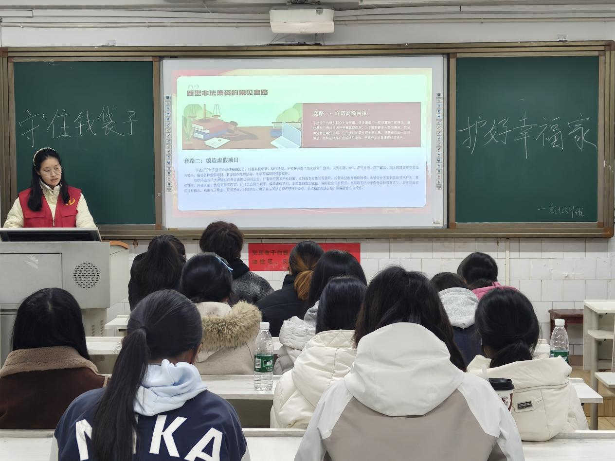 三月春风暖,雷锋精神传。近日,我院经济管理学院“青春防非志愿团”以雷锋月为契机,将防范非法金融活动宣传阵地聚焦校园课堂,在各班级开展“守住钱袋子 护好幸福家”主题班会活动,通过发放宣传册、有奖问答等互动形式,为在校学生送上了一堂生动的金融安全课。