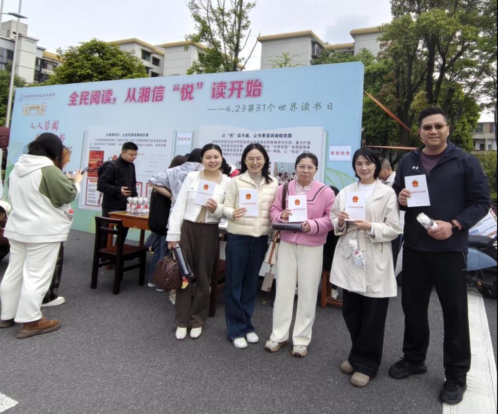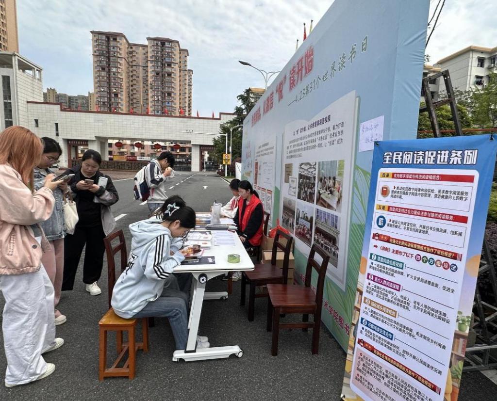 本次活动聚焦《条例》核心内容,严格围绕全民阅读推广、全民阅读服务、全民阅读保障等重点条款设计题目,旨在引导师生全面领会《条例》精神实质,推动《条例》在校园落地见效。活动采用线上答题与线下互动相结合的形式,线上依托“学习通”平台搭建专属答题通道,师生可随时扫码参与挑战,实时查看答题成绩与排名,形成比学赶超的良好氛围;线下在升旗广场设置活动展位,志愿者们现场讲解《条例》要点,发放《全民阅读促进条例》和“深入学习贯彻全民阅读促进条例”宣传页,用贴心的服务和有趣的形式吸引大批师生驻足参与,现场氛围热烈有序。