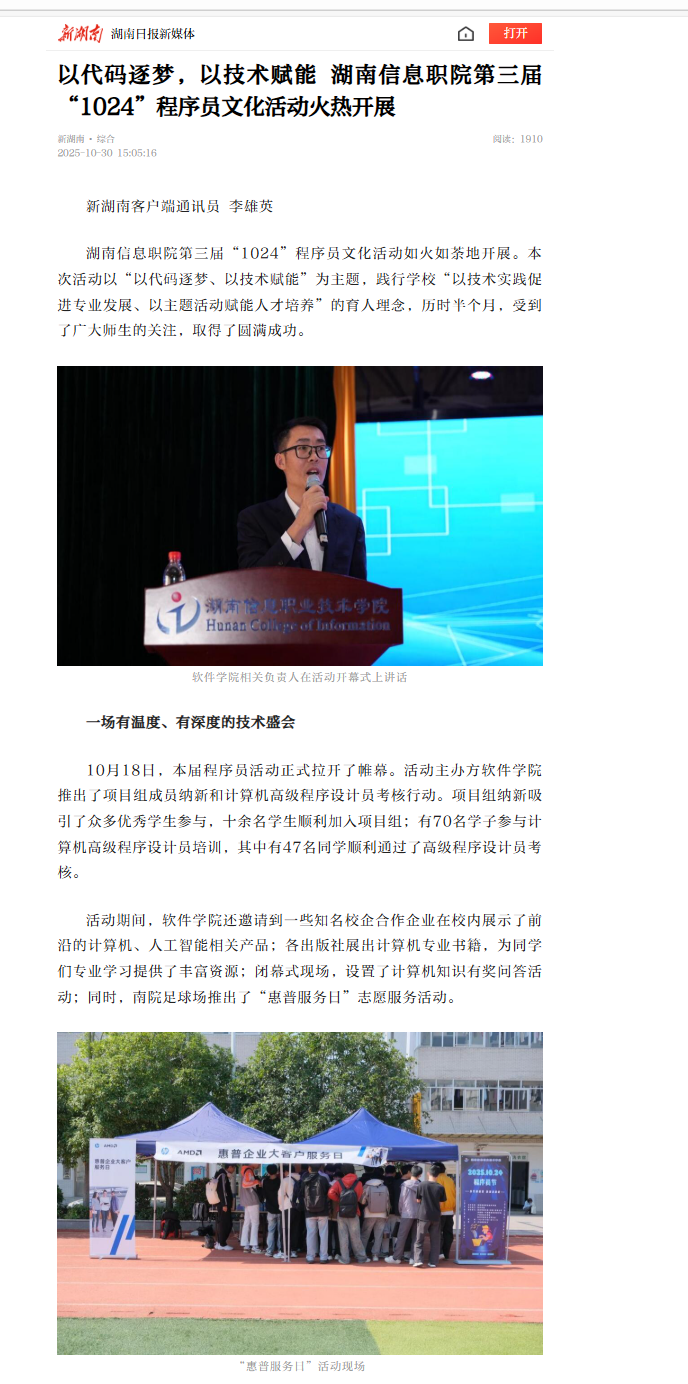 10月30日,新湖南发布《以代码逐梦,以技术赋能湖南信息职院第三届“1024”程序员文化活动火热开展》