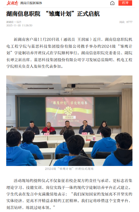 11月20日,新湖南发布《湖南信息职院"雏鹰计划"正式启航》