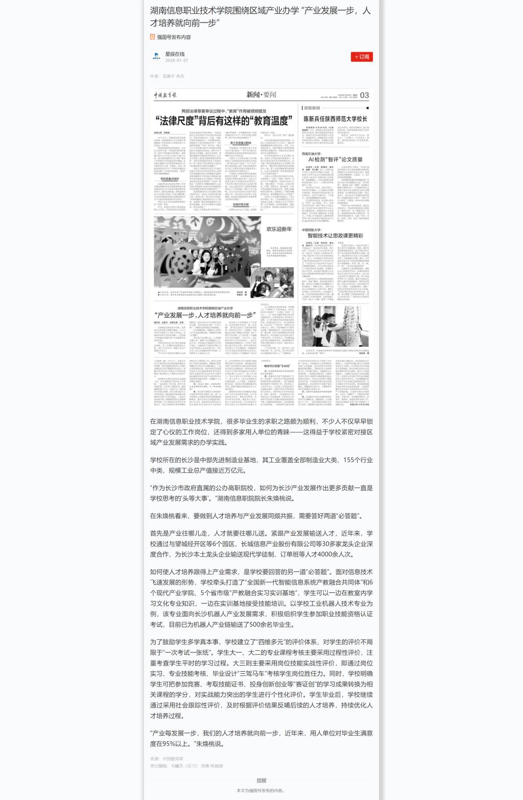 1月7日,星辰在线发布:《湖南信息职业技术学院围绕区域产业办学 “产业发展一步,人才培养就向前一步”》